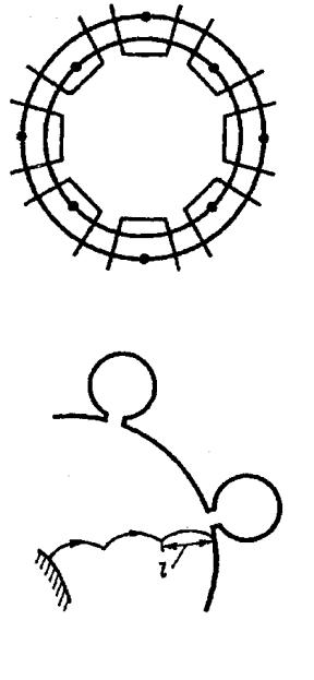 Для уменьшения вероятности перескоков частоты необходимо разнести частоты различных видов колебаний - сделать между ними больший частотный интервал. Из общей теории электрических цепей известно, что чем больше связь между колебательными контурами, тем больше различаются между собой частоты связи связанной системы. В магнетроне для разнесения частот колебаний применен тот же принцип. Резонаторы анодного блока соединяются между собой так называемыми связками - медными кольцами, соединяющими сегменты анодного блока и имеющими одинаковый потенциал, т. е. через один сегмент (рис. 12.16).