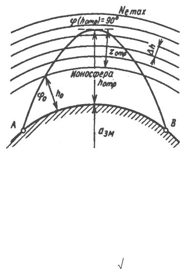 ласти ионосферы, где nИ(hОТР) = sin 0(h0) = 0, т.е. там, где диэлектрическая проницаемость достигает нулевого значения. Это будет иметь место в обла-