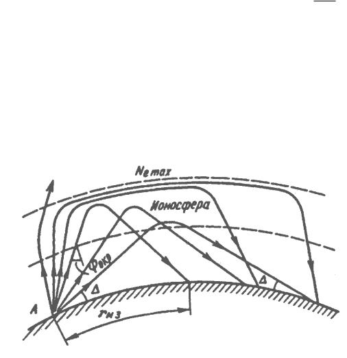 Реальные антенны, излучающие волны с частотами, которые отражаются от ионосферы (f < 30…40 МГц), имеют относительно широкую диаграмму направленности, поэтому на ионосферу одновременно падает пучок лучей под разными углами 0 (рисунок 4.8). Согласно (4.17), чем круче траектория, тем глубже волна проникает в слой, т.е. отражение волн одной и той же частоты происходит на разных высотах. Это означает, что радиусы кривизны
