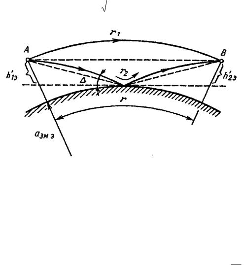 Электрическая неоднородность тропосферы, проявляющаяся в рефракции радиоволн, влияет на все параметры, от которых зависит поле в освещенной зоне. По сравнению со случаем прямолинейного распространения изменяются длины путей (рисунок 5.3) прямой r1 и отраженной r2 волн, т.е. сдвиг