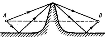 В рамках отражательной трактовки эффект усиления за счет препятствия можно пояснить следующим образом. Как показано на рисунке 5.5, вершина препятствия возбуждается двумя волнами: прямой и отраженной от Земли, амплитуды которых будем считать одинаковыми и равными E0. Если эти две волны складываются в фазе, то вершина препятствия возбуждается полем с амплитудой 2E0. Возбужденная вершина является источником вторичных волн, которые достигают точки приема также по двум путям: как прямая и отраженная от Земли волны, амплитуды которых примерно одинаковы. Если эти волны в точке приема складываются в фазе, то при идеальной ситуации напряженность поля в точке В будет равна 4E0.