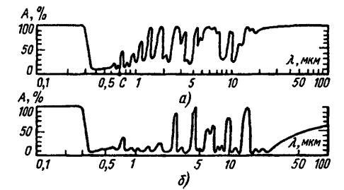 мощности): А = 1 – V2, где V – модуль множителя ослабления по напряженности поля. Поглощение А обычно выражается в процентах. Наглядное представление о распределении поглощения в диапазоне длин волн 0.01...100 мкм можно получить из рисунка 5.9, на котором приведены две записи спектра поглощения солнечного излучения у поверхности Земли (рисунок 5.9, а) и на высоте 11 км (рисунок 5.9, б). Видно, что ультрафиолетовые лучи с длиной волны до 0.3 мкм и инфракрасные лучи с длиной волны 25...100 мкм практически полностью поглощаются атмосферой (погонное ослабление составляет