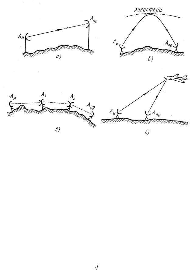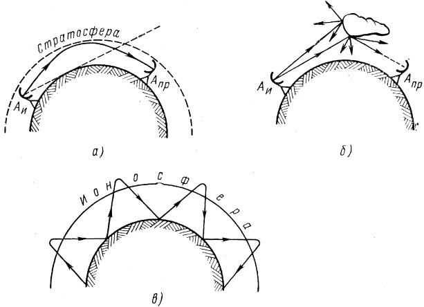 Ионосфера по-разному влияет на распространение радиоволн различных диапазонов. Например, радиоволны длиннее 6…10 м от нее отражаются. В результате многократных отражений от ионосферы и поверхности Земли (рисунок 2.8, в) такие радиоволны могут распространяться на весьма большие расстояния. Волны короче 6…10 м проходят через ионосферу. Как и в тропо-