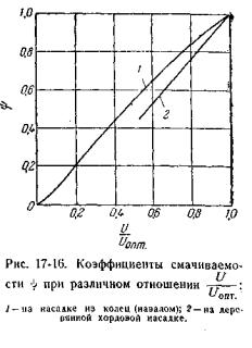 Если плотность орошения мала по сравнению с Uопт, то коэффициент смачиваемости имеет низкое значение, то есть насадка будет недостаточно смочена или использована не полностью. В этом случае следует применять насадку с меньшей удельной поверхностью, чтобы