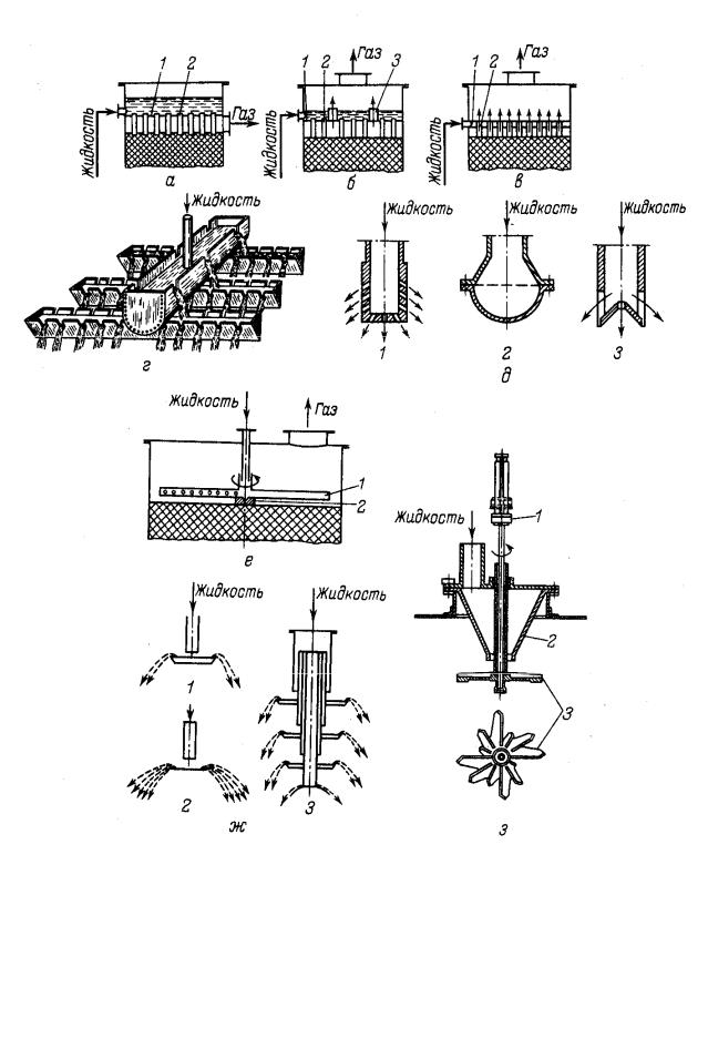 а - в – распределительные плиты: а – с затопленными отверстиями; б – с затопленными отверстиями и газовыми патрубками; в – со свободным сливом (1- решетка; 2 – патрубки для жидкости; 3 – патрубки для газа); г – распределительные желоба; д – брызгалки (1 – цилиндрическая; 2 – полушаровая; 3 – щелевая); е – ороситель типа снегерова колеса (1 – вращающаяся дырчатая труба; 2 – подпятник); ж, з – разбрызгивающие оросители: ж – тарельчатые разбрызгиватели (1 – с тарелкой с бортами; 2 – с тарелкой без бортов; 3 – многотарельчатый); з – центробежный (1 – привод; 2 – распределительный