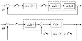 Рис. 1. Структурные схемы импульсных систем с последовательной дискретной коррекцией (а) и дискретной коррекцией в цепи ОС (б)