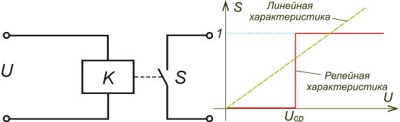 Характеристика преобразования входного напряжения U в состояние контактов S для реле показана на рис. 4. Это ступенчатая характеристика, изменение уровня которой происходит при входном напряжении U=Uср. Характеристика подобного вида получила название релейная характеристика. Релейная характеристика является одним из случаев нелинейной характеристики [1].