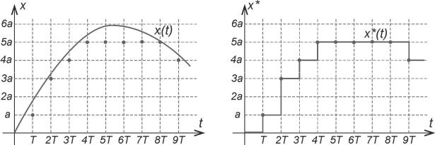 Графики квантуемого и квантованного сигналов показаны на рис. 5. На графике квантуемого сигнала x(t) точками показаны значения достигнутых уровней, ближайших к значениям квантуемого сигнала в момент квантования. Изменения квантованного сигнала происходят в моменты квантования, кратные периоду T квантования по времени. Таким образом, квантованный сигнал будет характеризоваться периодом квантования и значением ближайшего фиксированного уровня [1,3].