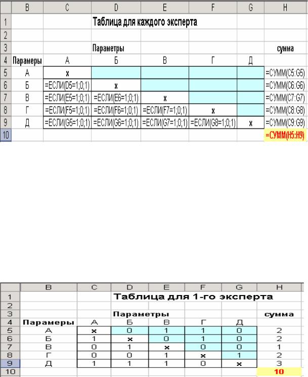 Пример заполнения такой таблицы первым экспертом приведен на рис. 53, из которого видно, что по оценке этого эксперта параметр А менее важен, чем параметры Б (D5 = 0) и Д (G5 = 0), но более важен, чем B (E5 = 1) и Г (F5 = 1).