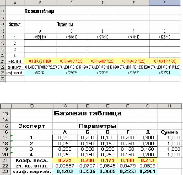 Составить базовую таблицу (рис. 54.), в ячейки которой введены формулы для 1-го эксперта.