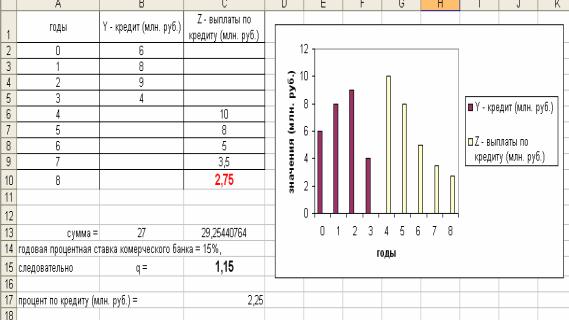 Также на рис. 5 представлен выбранный нами план погашения кредита. Видно, что последний взнос в конце 8-го года выплат Z8 = 2,75 млн руб. Такой план выбран потому, что он имеет достаточно низкий процент по кредиту, равный 2 254 407 руб. 64 коп. Другие просчитанные планы выплат дают больше процентов по кредиту.