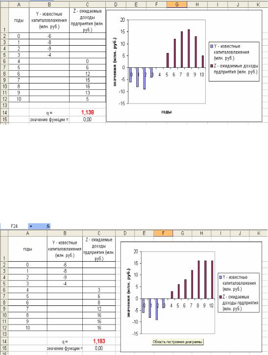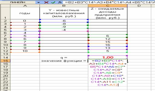По индексу прибыльности определяется выгодность инвестиций. Здесь в ячейку С14 введено приближенное значение величины q = 1, а в ячейку С15 введена формула балансового уравнения.