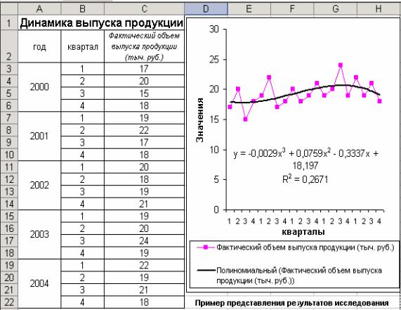 Пусть необходимо выявить основную тенденцию (тренд) фактического объема выпускаемой продукции за период с 2000 по 2004 гг. Данные примера (поквартальные) показаны на рис. 22. Наша задача спрогнозировать объем выпускаемой продукции на 2005 г.