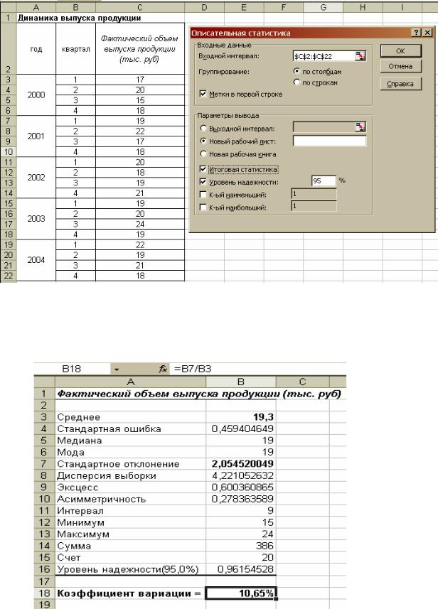 В этом случае для количественной оценки прогноза применяется описательная статистика. Для вызова этой функции необходимо на панели меню выбрать команду: Сервис Анализ данных Описательная статистика. Затем заполняется диалоговое окно