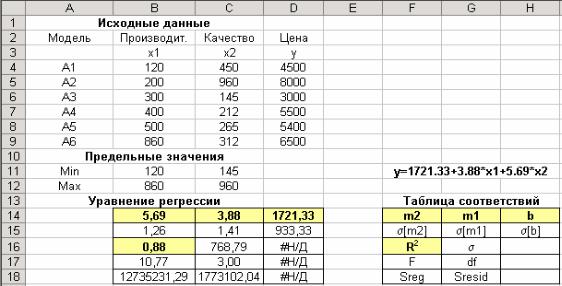 Смысл полученных величин показан в таблице соответствий на рис. 25, где приняты следующие обозначения: m2, m1, b искомые коэффициенты в уравнении линейной регрессии. Таким образом, искомое уравнение имеет вид y = 1721,33 + 3,88x1 + 5,69x2. Полученное уравнение описывает зависимость экономического параметра (цены) от технических (производительности и качества). При этом нельзя забывать, что это уравнение регрессии справедливо