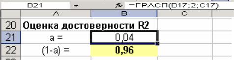 Для этого (рис. 26) курсор в В21 Мастер функций Статистические FРАСП (x, степени свободы 1, степени свободы 2). Здесь х Fрасч (т. е. В17 на рис. 25), степени свободы 1 число аргументов (n=2), степени свободы 2 = df (т. е. C17 на рис. 25).