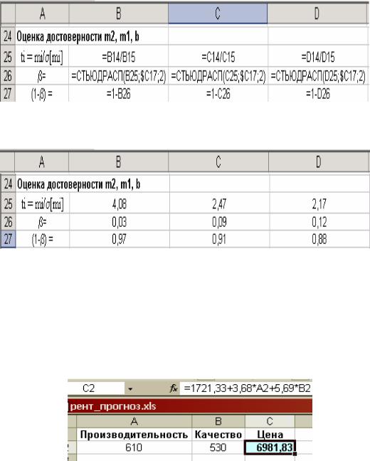На рис. 28 в ячейках В27:D27 показаны вероятности того, что коэффициенты уравнения регрессии достоверны. Самый значимый параметр это качество, то есть параметр x2 = 520 при m2 = 5,69.
