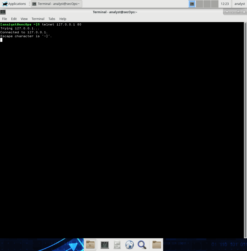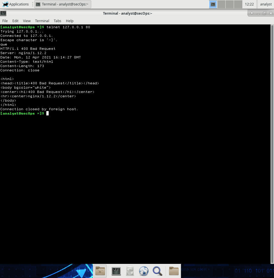В первой части лабораторной работы мы запускали nginx и назначали ему TCP-порт 80. Хотя быстрый поиск в Google показал, что nginx является простым веб-сервером, как аналитику убедиться, что это действительно так? Что делать, если хакер просто изменил имя вредоносного ПО на nginx, чтобы сделать ее похожей на популярный веб-сервер? С помощью telnet подключитесь к локальному узлу через TCP-порт 80.