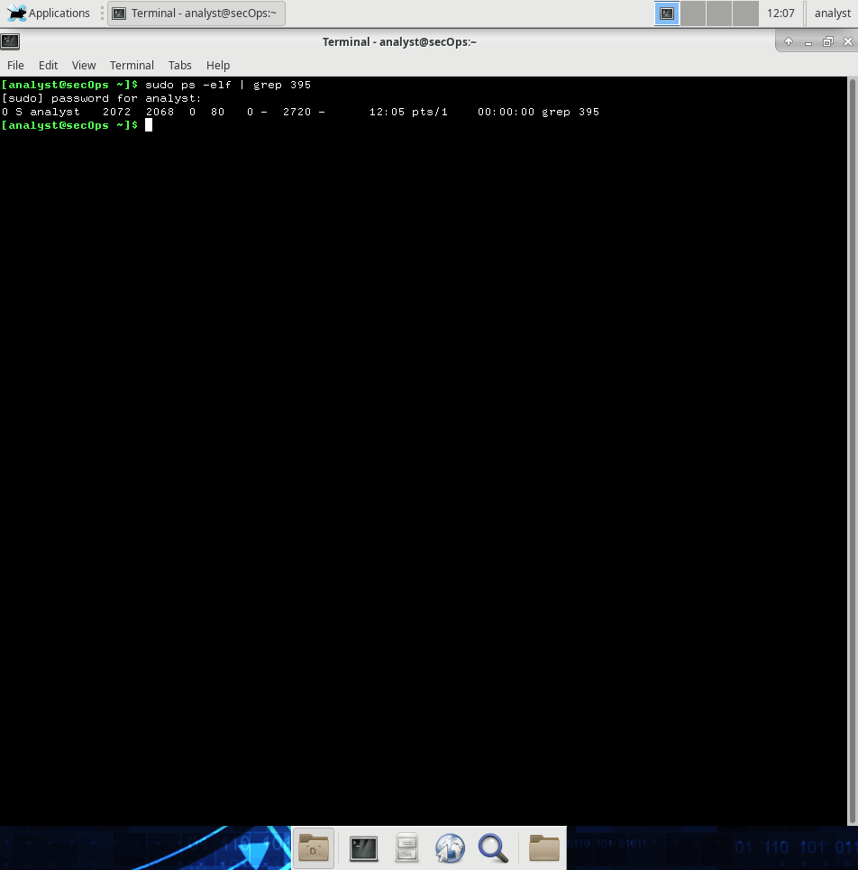 Третья строка показывает, что владельцем процесса c PID 3789 является пользователь analyst, а запущен он процессом с PID 1872 с командной строкой grep 395.
