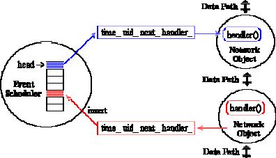 В этом разделе речь идет о дискретных планировщиках событий NS. Главные пользователи планировщика событий – сетевые компоненты, которые моделируют задержку обработки пакета или которым необходимы таймеры. На рисунке 2 показаны сетевые объекты, использующие планировщик событий. Заметим, что есть сетевые объекты, которые выдают событие, и есть объекты, которые обрабатывают событие позднее в намеченное время. Также заметим, что путь данных между сетевыми объектами отличается от пути событий. Действительно, пакеты передаются от одного сетевого объекта другому, используя метод отправителя send(Packet* p) {target_->recv(p)} и метод получате-