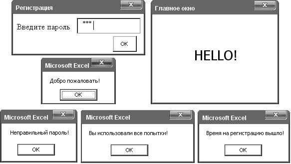При неправильном или несвоевременном вводе пароля выводится соответствующее сообщение, и работа приложения заканчивается. Внешний вид форм и диалоговых окон на разных стадиях работы приложения показан на рис. 84.