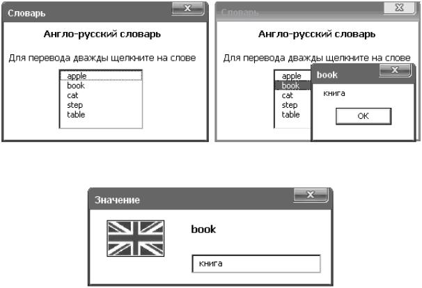 На форме расположены метки с пояснительным текстом и список с несколькими английскими словами. При двойном щелчке по списку анализируется состояние списка (какой элемент выбран) и в диалоговом окне выводится выбранное слово и его перевод. Внешний вид формы до и после выбора слова показан на рис. 85. Вывод данных в диалоговое окно с заголовком (см. прил. 1).