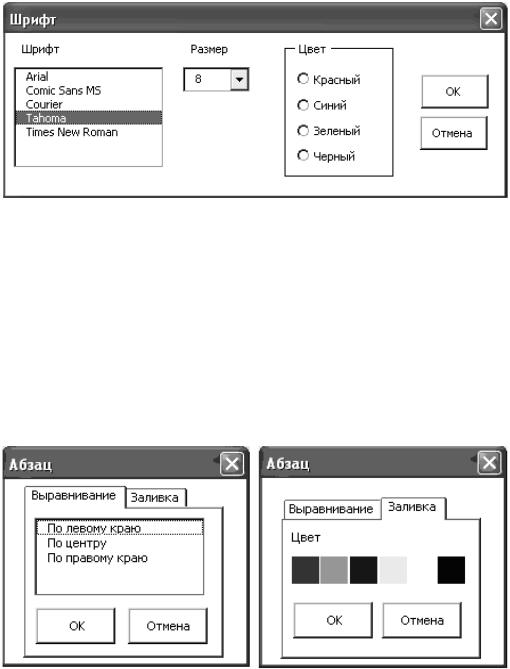 На четвертой форме расположен набор из двух страниц: «Выравнивание» и «Заливка» (рис. 91). На странице «Выравнивание» расположены список для выбора вида выравнивания (формируется при активации формы), кнопки «ОК» и «Отмена». При нажатии кнопки «ОК» в поле на главной форме меняется вид выравнивания текста и четвертая форма скрывается. При нажатии кнопки «Отмена» четвертая форма скрывается.
