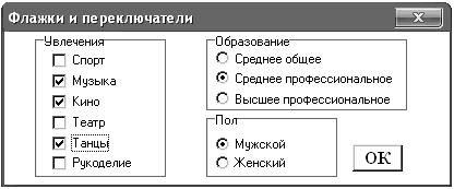 Зададим свойства Caption и Font для всех объектов, свойство Value для первого переключателя в группе «Пол» должно иметь значение True (один из переключателей обязательно должен быть выбран).