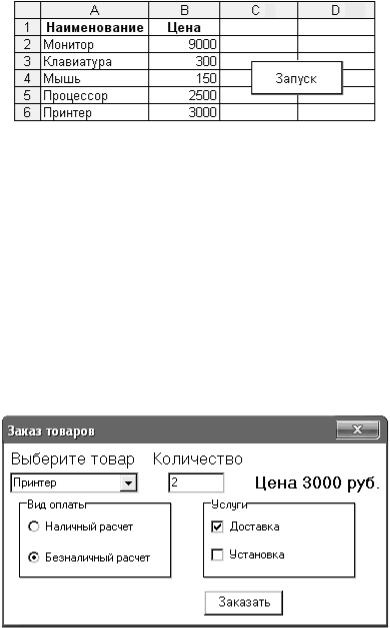 На рабочем листе «Товары» составлена таблица с данными о товарах (рис. 14) и расположена кнопка «Запуск» для открытия формы.