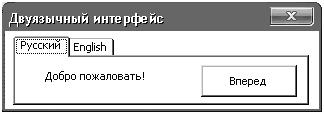 На форме расположен набор из двух вкладок, метка и кнопка. При выборе вкладки в метке выводится текст приветствия, а на