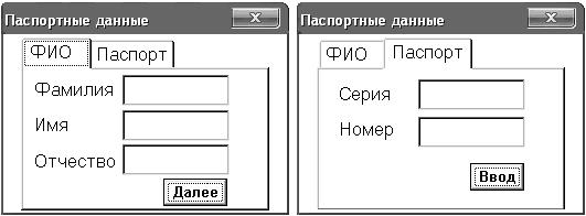 На форме расположен набор из двух страниц. На странице «ФИО» размещены метки с пояснительным текстом, три поля для ввода данных и кнопка «Далее», считывающая введенные данные и осуществляющая переход на вторую страницу. На странице «Паспорт» размещены метки с пояснительным текстом, два поля для ввода данных и кнопка «Ввод», формирующая отчет по введенным данным на рабочем листе Excel. Внешний вид формы показан на рис. 19.
