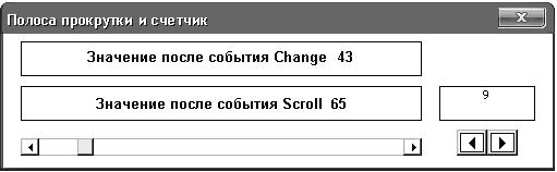 На форме расположены три метки, полоса прокрутки и счетчик. При прокрутке или перемещении бегунка на полосе прокрутки или при прокрутке счетчика в метках отображаются соответствующие значения свойства Value. Внешний вид формы после изменения счетчика и переноса бегунка на полосе вправо, а затем прокрутки полосы влево показан на рис. 20.