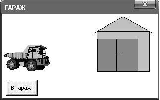 На форме расположены: рисунок с автомобилем, рисунок с гаражом, две кнопки «В гараж» и «Из гаража» на одном и том же месте (видна только кнопка «В гараж»). При нажатии на кнопку «В гараж» автомобиль начинает движение к гаражу, как только он доезжает до гаража, картинка гаража заменяется на картинку с открытыми воротами, автомобиль продолжает движение пока не въедет в гараж, останавливается, ворота закрываются (картинка с гаражом заменяется на прежнюю), кнопка «В гараж» становится невидимой, а кнопка «Из гаража» – видимой. Аналогичные действия происходят при нажатии на кнопку «Из гаража», только движение осуществляется в другую сторону и рисунок автомобиля повернут в другую сторону. Внешний вид формы до начала работы программы показан на рис. 24.