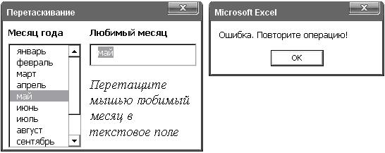 На форме расположены список с названиями месяцев, поле и метка с пояснительным текстом. При помощи мыши из списка перетаскивают в поле необходимый элемент, выделенный в списке. При неправильном действии, т.е. перетаскивании не в поле, происходит вывод предупреждающего сообщения. Список формируется при активации формы из значений на рабочем листе