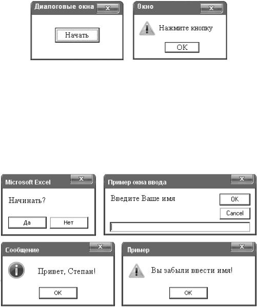 После нажатия кнопки «ОК» появляется диалоговое окно с текстом «Начать?» и кнопками «Да» и «Нет». Если пользователь нажал кнопку «Да», то у него запрашивается его имя. Затем, если пользователь ввел имя, выводится информационное диалоговое окно с приветствием, в противном случае выводится предупреждающее диалоговое окно с соответствующим сообщением (рис. 27).