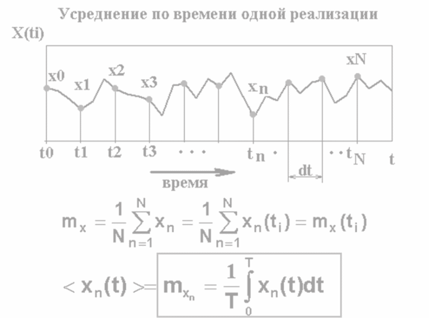 Стационарный случайный процесс называется эргодическим, если при нахождении его моментных функций усреднение по статистическому ансамблю можно заменить усреднением по времени.