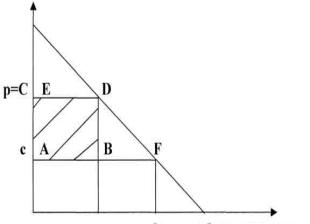 Предположим (рис.6), что стоимость производства какого-то товара до появления новшества была равна С, и конкурентное равновесие на рынке этого товара достигалось в точке D с координатами р, q. Благодаря новшеству, защищенному патентом, одна из организаций снизила производство своего товара до величины с. При этом, уменьшив цену товара чуть ниже р, она получила возможность завоевать практически весь рынок. Сохранив на рынке прежний уровень продаж q, организация получила прибыль равную ABDE. Если бы она не имела патента и конкуренты тоже могли бы использовать данное новшество, цена на рынке упала бы до величины с, а объем продаж вырос бы до уровня Q. В результате общество получило бы дополнительно продукции на сумму, равную BDF. В этом случае организация-разработчик новшества лишается своей монопольной прибыли, заработанной благодаря успешным усилиям в сфере НИОКР.