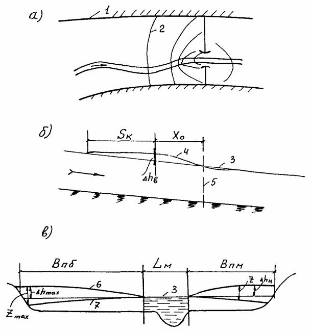 Рис. 8.1. Рельеф водной поверхности в районе мостового перехода: а – схематизированный план водной поверхности; б – продольный профиль водной поверхности; в – профили водной поверхности с верховой (6) и низовой (7)