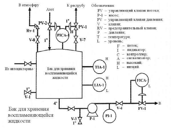 Задача 30.Система хранения воспламеняющейся жидкости в виде диаграммы распределения ресурсов и оборудования представлена на рис. 2, где G1 – бак для хранения воспламеняющейся жидкости. Бак спроектирован так, чтобы удерживать воспламеняющуюся жидкость под слабым давлением азота. Система управления (PICA-1) контролирует давление. Кроме этого, бак защищен с помощью клапана, который перекрывается в аварийных ситуациях. Жидкость питает бак через автоцистерну. Насос (Р-1) перекачивает воспламеняющуюся жидкость для дальнейшей переработки.