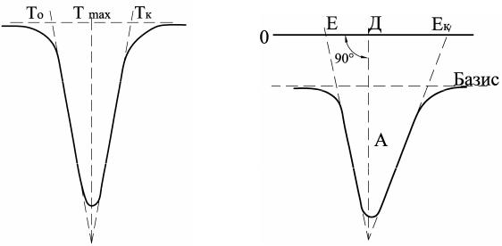 При расшифровке результатов анализа часто указывают не начало и конец реакции, а интервал температур, в котором она протекает, т.е. Т0 – Тк, или температуру максимума термического эффекта Тmах. Последние устанавливают как точку пересечения касательных к правой и левой ветвям пика.