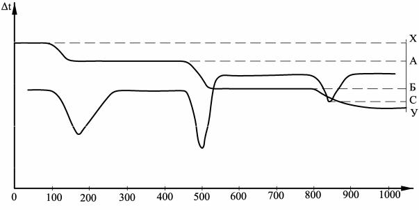 Обработку термограмм производят обычным способом (рис.7). Вычисляют температуры начала, максимума и конца термических эффектов на дифференциальной кривой. На кривой потери веса отмечают точки перегибов, через которые проводят горизонтальные линии, параллельные оси абсцисс, до пересечения с крайней правой вертикальной линией (осью). Измеряют общее расстояние Х – У в мм и, зная общую потерю веса материала при нагревании (в %), устанавливают цену деления шкалы Х - У. В рассматриваемом случае потеря веса составляет 20 %, расстояние Х - У равно 35 мм и цена деления - 20: 35 = 0,57 % потери веса на 1 мм. Потери веса на отдельных участках термогравиметрической кривой составляют: ХА - 5,72 %; АБ - 8,58 %, БС - 3,99 %; СУ - 1,71 %.