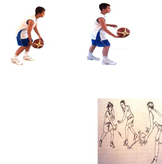 Теперь при движении вперед левая рука остается впереди до тех пор, пока мяч не окажется перед тобой (рис. 11в). Затем левая рука отводится влево, а мяч посылается вперед кистью правой руки (рис. 11г). Движение завершается только правой рукой, причем она полностью выпрямлена, а вес тела перенесен вперед на левую ногу. Разумеется, точно так же эту передачу можно сделать и левой рукой.