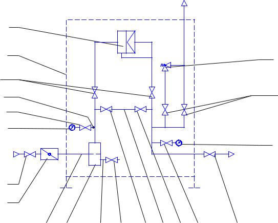 1 – регулятор давления газа с предохранительным запорным клапаном (ПЗК); 2 – шкаф; 3,3´ – краны шаровые; 4 – вентиль; 5 – манометр; 6 – задвижка; 7 – стальная заглушка; 8 – основная линия редуцирования; 9 – фильтр газовый; 10 – кран; 11, 11´ – вентили; 12 – байпасная линия; 13 – вентиль; 14 – задвижка; 15 – манометр; 16, 16´ – вентили; 17 – клапан предохранительный сбросной; 18 – импульсный трубопровод