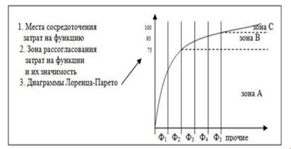 Рис.4.1. Диаграмма Лоренца-Парето для определения зон сосредоточения затрат на функцию