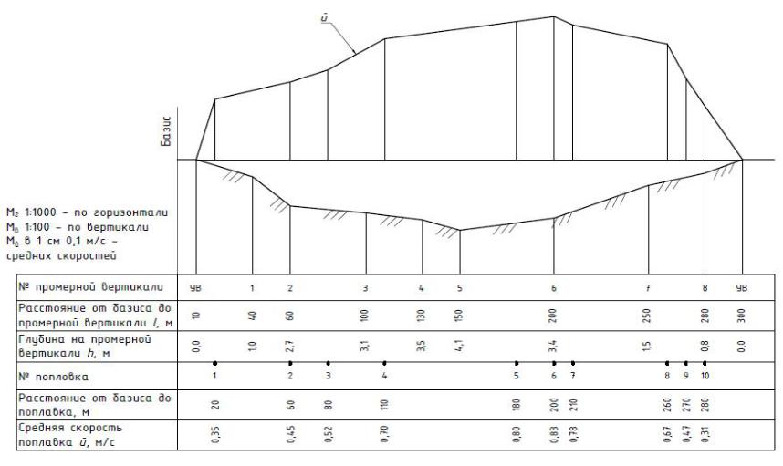 Пр мер построен я поперечного профиля створа с эпюрой средних скоростей |