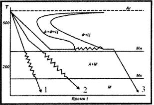 В.2.3.17. Режим термической обработки 2 (см. рис.) соответствует закалке... 1) изотермической; 2) ступенчатой; 3) непрерывной; 4) прерывистой.