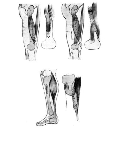 в, г – мышечный лоскут на проксимальной ножке, выкроенный из икроножной мышцы, для закрытия дефекта верхней трети большеберцовой