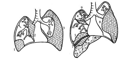 1 – осумкованный гнойник в синусе; 2 – медиастинальный; 3 – тотальный; 4 – междолевой; 5 – наддиафрагмальный; 6 – поддиафрагмальный; 7 – диафрагмальный; 8 – пристеночный; 9 – верхушечный