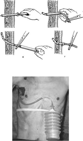 ционной системе (водяной насос, электрический аспиратор, вакуумная установка). Использование двупросветных дренажей позволяет не только эвакуировать гнойное содержимое из грудной полости, но и промывать последнюю растворами антисептиков. В клинической практике при лечении гнойного плеврита применяется вакуумный аппарат, предложенный Лавреновичем (см. рис. 10, б) или активный вакуумный аппарат«гармошка» (рис.62).