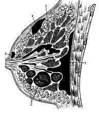 мастите гнойник локализуется позади молочной железы, отслаивая ее от поверхностной фасции большой грудной мышцы.